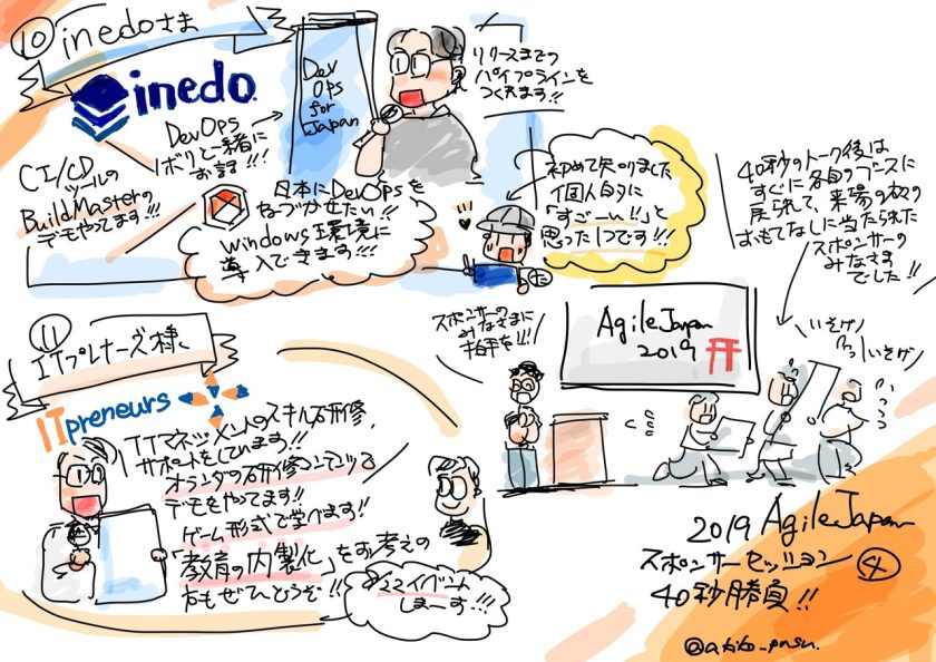 ランチタイムには、全スポンサーによる各40秒の自社紹介セッションがメインルームで設けられましたが、その様子も全てグラレコ化がおこなわれ、Inedo Japanの自社紹介も素敵なグラレコとしてご提供頂きました。